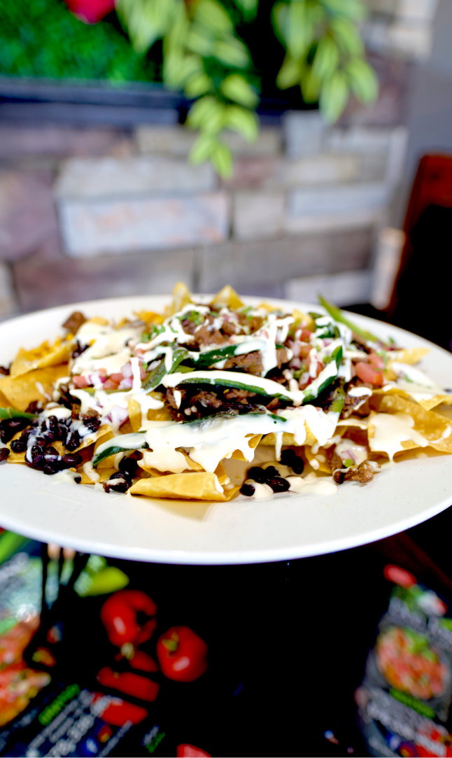 Steak, chicken or pork, jalapenos pepper, pico de gallo, corn, sour cream, black beans covered with cheese sauce